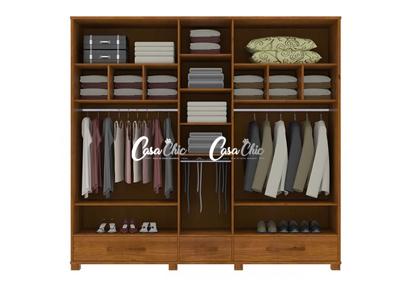 Com prateleiras e puxadores em madeira